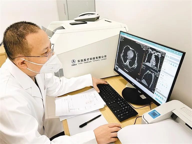 10日上午,在杜城社區(qū)衛(wèi)生服務(wù)中心診室門(mén)前,等候拍片的患者不多。在工作人員引導(dǎo)下,大家有序進(jìn)入拍攝區(qū)。診室內(nèi),陜西省康復(fù)醫(yī)院影像一科主任高雅鵬正在一個(gè)看似與普通顯示器沒(méi)什么兩樣的電腦前書(shū)寫(xiě)診斷報(bào)告?!氨绕鹨话愕腃T靜態(tài)閱片,在這臺(tái)顯示器的幫助下,我們可以實(shí)現(xiàn)多角度、多方位、動(dòng)態(tài)式閱片,讓診斷更加細(xì)致精準(zhǔn)?!?高雅鵬說(shuō),這臺(tái)CT機(jī)的配置完全可以滿(mǎn)足周邊居民對(duì)于肺部CT的拍片需求。