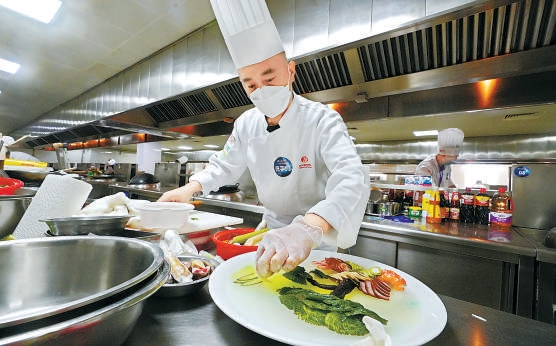 比賽開始后,首先進行藝術冷拼制作環(huán)節(jié),規(guī)定用時1小時;隨后進行其余熱菜,用時兩小時?!斑@主要是考慮到比賽的公正性,每位選手在同一時間段制作完成相同的菜品,評委統(tǒng)一品嘗、打分,避免同一菜品因出菜時間不同導致評委打分忽高忽低?!钡谌龑谩氨本┐蠊そ场敝惺脚胝{(diào)師比賽裁判長侯玉瑞告訴記者,3小時制作完成4道菜品對選手來說難度不小,“平時廚師操作是有分工的,但比賽現(xiàn)場所有工序都要選手一個人完成,而且比賽時間也很緊張。通常制作一道冷拼的時間是90分鐘,這次比賽不僅操作時間短,還要求至少使用4葷3素7種食材,對食材的選料、用料,色彩搭配以及刀工要求都非常高?!焙钣袢鹫f,冷拼刀工要求食材既要切得薄,外表還要平整、不毛糙,整體擺盤要有創(chuàng)意。
