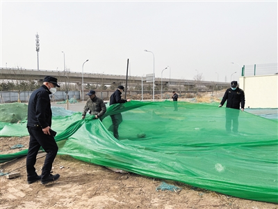 3月22日,石景山古城街道綜合行政執(zhí)法人員來(lái)到轄區(qū)內(nèi)工地,要求施工單位對(duì)裸露地面、渣土堆放場(chǎng)所及時(shí)苫蓋,施工期間進(jìn)行灑水降塵,渣土運(yùn)輸車(chē)輛確保清潔到位上路不遺撒,從源頭杜絕揚(yáng)塵污染源的發(fā)生。新京報(bào)記者 浦峰 通訊員 王亞楠 攝