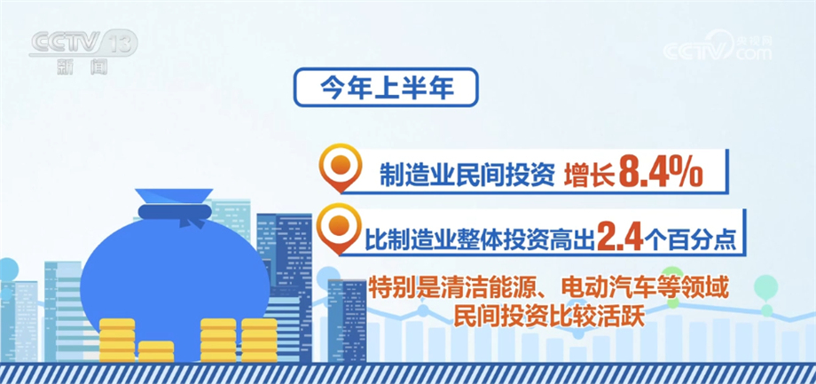 國家發(fā)展改革委相關(guān)負(fù)責(zé)人表示,當(dāng)前,民間投資結(jié)構(gòu)持續(xù)優(yōu)化,一些領(lǐng)域民間投資顯現(xiàn)了不少亮點(diǎn)。今年上半年,除房地產(chǎn)開發(fā)以外的民間投資同比增長9.4%,增速比全部投資高5.6個(gè)百分點(diǎn);制造業(yè)民間投資增長8.4%,比制造業(yè)整體投資高出2.4個(gè)百分點(diǎn),特別是清潔能源、電動汽車等領(lǐng)域民間投資比較活躍;基礎(chǔ)設(shè)施民間投資增長15.6%,比基礎(chǔ)設(shè)施整體投資高出8.4個(gè)百分點(diǎn),呈現(xiàn)出較強(qiáng)的投資信心和投資動力。