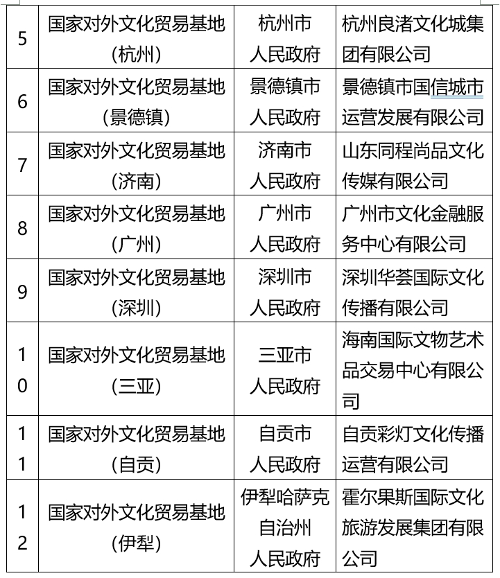 央廣網(wǎng)北京10月19日消息 據(jù)文化和旅游部網(wǎng)站消息,為全面貫徹落實(shí)黨的二十大精神,推動(dòng)文化和旅游對(duì)外貿(mào)易高質(zhì)量發(fā)展,根據(jù)《文化和旅游部辦公廳 商務(wù)部辦公廳關(guān)于開展新一批國(guó)家對(duì)外文化貿(mào)易基地申報(bào)工作的通知》(辦產(chǎn)業(yè)發(fā)〔2022〕124號(hào)),在各?。▍^(qū)、市)、新疆生產(chǎn)建設(shè)兵團(tuán)推薦申報(bào)基礎(chǔ)上,文化和旅游部、商務(wù)部確定新一批國(guó)家對(duì)外文化貿(mào)易基地(共12家,含復(fù)核通過(guò)2家),現(xiàn)予公布。
