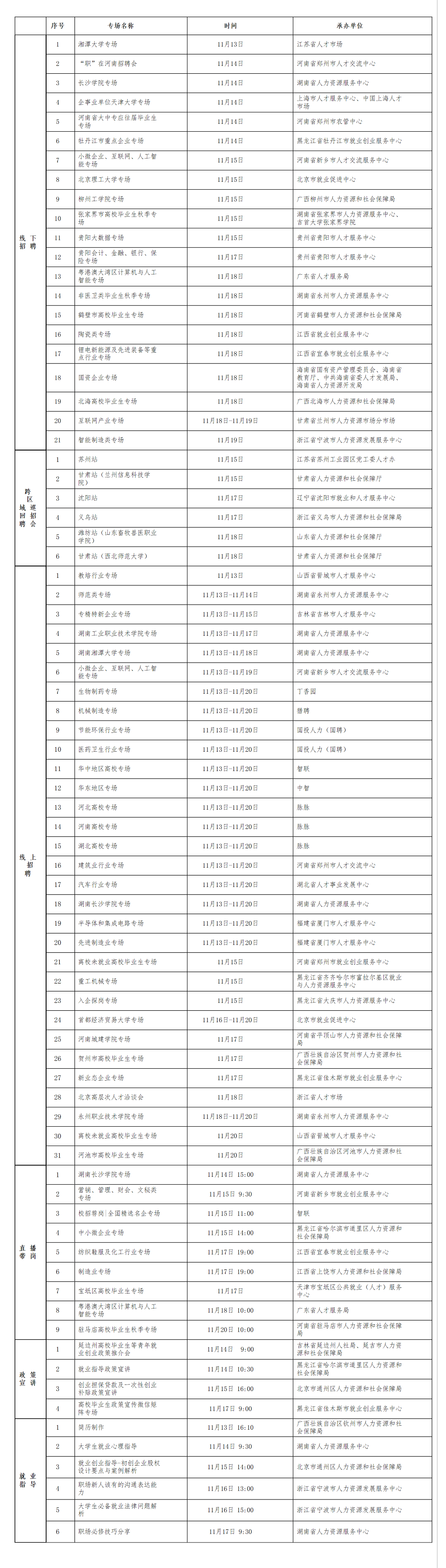 央廣網(wǎng)北京11月15日消息(記者 馮儀)人力資源和社會保障部2023年大中城市聯(lián)合招聘高校畢業(yè)生秋季專場活動近期將推出第四批共77場特色服務(wù)活動。包括智能制造類、互聯(lián)網(wǎng)產(chǎn)業(yè)、陶瓷類等21場線下專場招聘會,6場跨區(qū)域巡回招聘會,教培行業(yè)、生物制藥、機(jī)械制造等31場線上專場招聘會,9場直播帶崗活動,4場政策宣講直播(錄播)課以及6場就業(yè)指導(dǎo)直播(錄播)課。