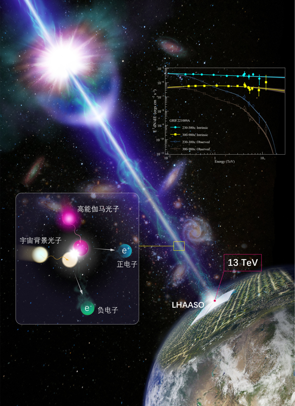 國家重大科技基礎(chǔ)設(shè)施“高海拔宇宙線觀測站(LHAASO)”(簡稱“拉索”)正式發(fā)布了迄今最亮的伽馬射線暴(簡稱“伽馬暴”,編號GRB 221009A)的高能伽馬輻射的精確能譜,該結(jié)果挑戰(zhàn)了傳統(tǒng)的伽馬暴余輝的標(biāo)準(zhǔn)輻射模型,揭示出宇宙背景光在紅外波段強度低于預(yù)期。同時,該能譜為檢驗愛因斯坦相對論的適用范圍、探索暗物質(zhì)候選粒子——軸子等新物理研究方面提供了重要信息。相關(guān)結(jié)果于北京時間11月16日在《科學(xué)進展》(Science Advances)上發(fā)表,由中國科學(xué)院高能物理研究所牽頭的拉索國際合作組完成。