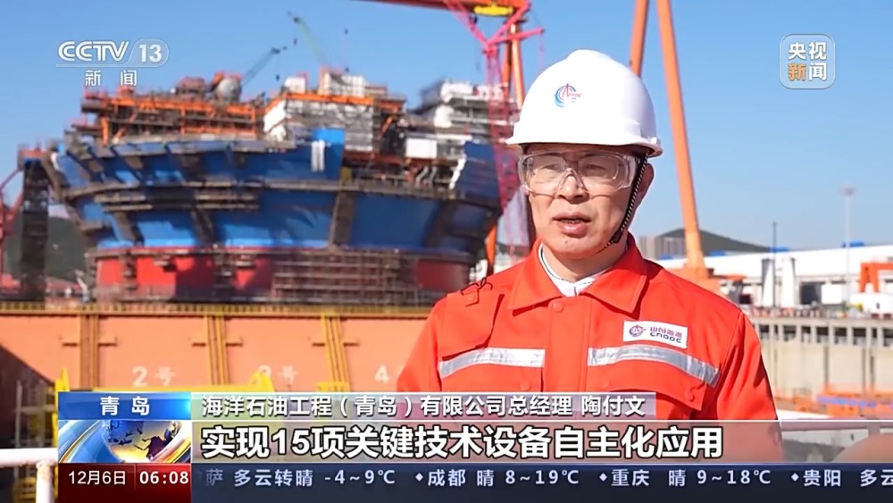 海洋石油工程(青島)有限公司總經(jīng)理 陶付文:創(chuàng)新采用一體化建造工藝和雙龍門吊集成技術(shù),實現(xiàn)15項關鍵技術(shù)設備自主化應用,使我國具備了根據(jù)不同油田、不同海域,自主設計制造不同類型深水油氣裝備的能力。