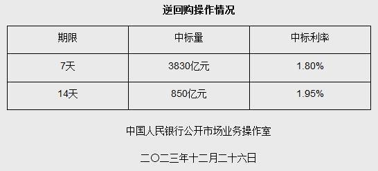 中新網(wǎng)12月26日電 據(jù)央行網(wǎng)站消息,為維護年末流動性合理充裕,2023年12月26日人民銀行以利率招標(biāo)方式開展了4680億元7天期和14天期逆回購操作。具體情況如下: