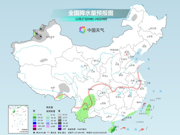 具體來看,今天,內(nèi)蒙古東北部、黑龍江東部、吉林東部、新疆北部、四川南部等地部分地區(qū)有小到中雪或雨夾雪。四川南部、云南中西部、海南島大部等地部分地區(qū)有小雨。