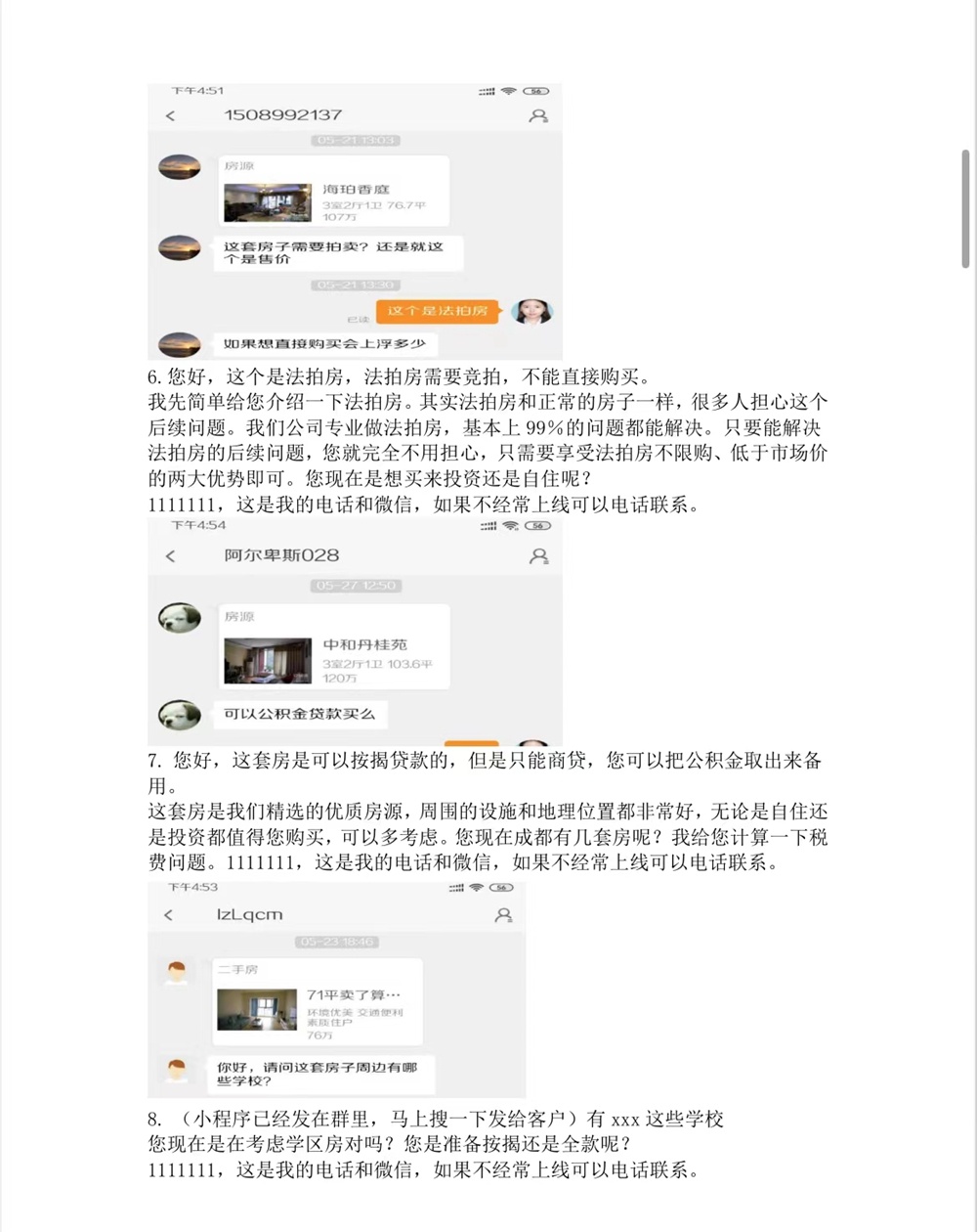 吳先生說,他所在的維權(quán)群里有30多位消費(fèi)者,盡管大家是與不同中介簽訂的合同,但梳理發(fā)現(xiàn),這些“法拍房中介”前期向客戶推銷時(shí)有固定的話術(shù)?!暗谝?,就是說現(xiàn)在很多房子在拍賣;依據(jù)我們的經(jīng)驗(yàn),在這一帶,這種類型的房子二十幾萬就能拿下來了;他就告訴你,基本上這個(gè)價(jià)格不會(huì)有什么變化的,你只要跟我們簽約,我們就能幫你服務(wù)、幫你拿到。”