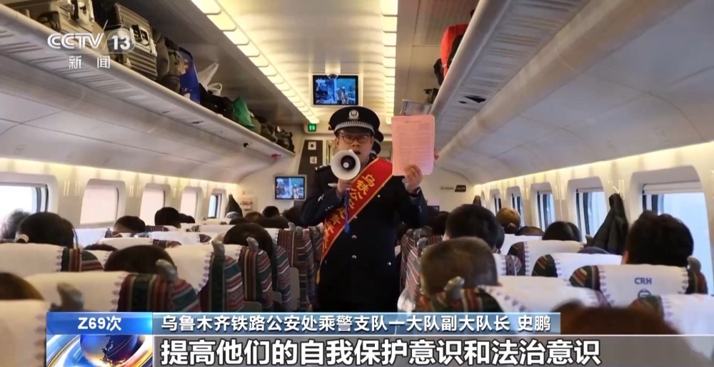 烏魯木齊鐵路公安處乘警支隊(duì)一大隊(duì)副大隊(duì)長 史鵬:希望通過這種方式,能夠讓乘坐我們列車的旅客提高他們的自我保護(hù)意識和法治意識,確保旅客們平安出行。