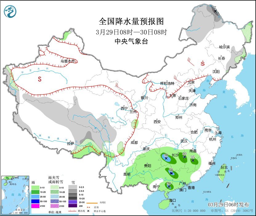 3月29日8時(shí)至30日8時(shí),內(nèi)蒙古東北部、黑龍江西北部和東部、吉林東部、西藏東部、青海西部等地部分地區(qū)有小到中雪或雨夾雪,其中,黑龍江西北部部分地區(qū)有大雪(5~7毫米)。湖南西部和東部、江西中南部、廣西東部、廣東中西部等地部分地區(qū)有中到大雨,其中,廣西東北部部分地區(qū)有暴雨(50~70毫米)。內(nèi)蒙古東南部和西北部、河北北部等地部分地區(qū)有4~6級(jí)風(fēng)。