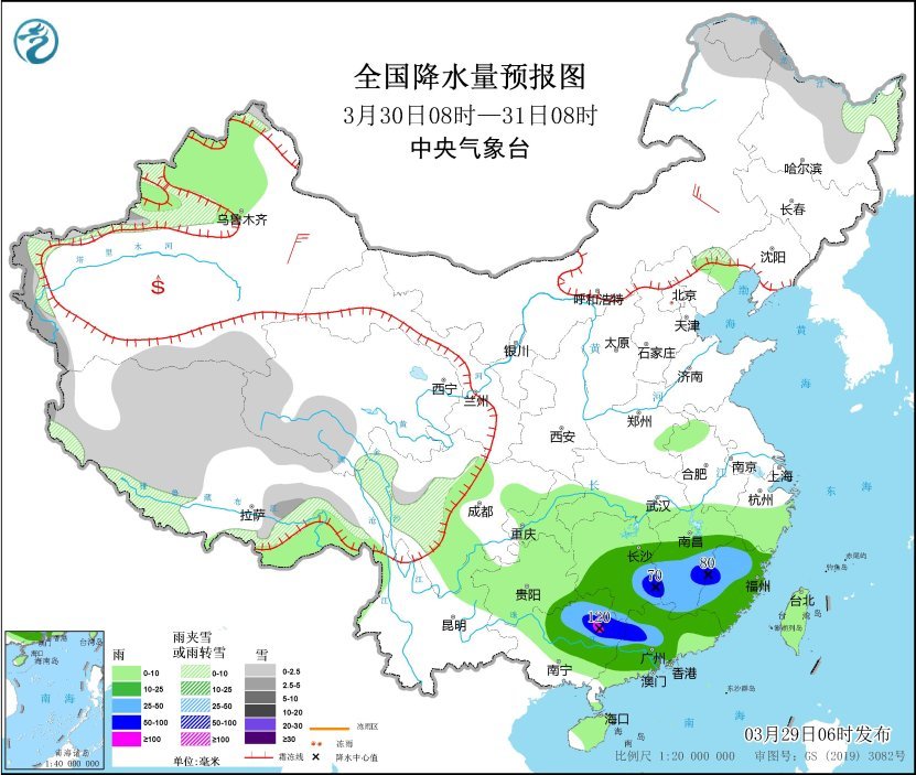 3月30日8時(shí)至31日8時(shí),黑龍江北部、新疆南疆高海拔山區(qū)、西藏大部、青海西部、川西高原南部等地部分地區(qū)有小到中雪或雨夾雪。湖南中南部、江南中南部、福建大部、廣西西北部、廣東大部等地部分地區(qū)有中到大雨,其中,湖南東南部、江西西南部和東部、福建西部、廣西東北部、廣東西部等地部分地區(qū)有暴雨或大暴雨(100~120毫米)。內(nèi)蒙古東南部、新疆東部等地部分地區(qū)有4~5級(jí)風(fēng)。