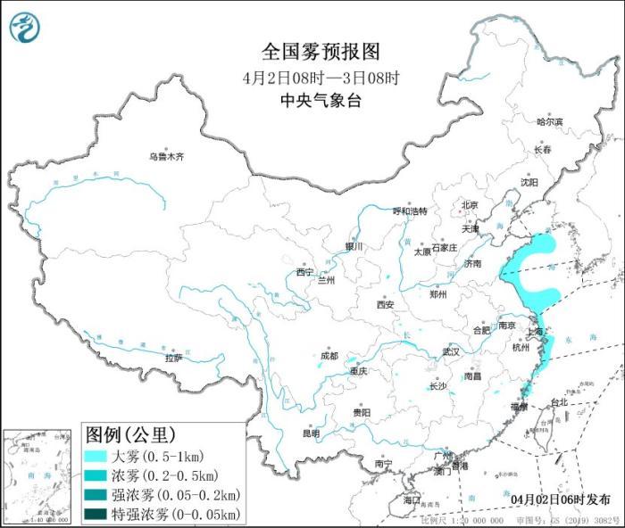 預(yù)計,4月2日白天,黃海中西部海域、山東半島東部和南部沿岸海域、浙江沿岸海域?qū)⒂心芤姸炔蛔?公里的大霧。此外,4月2日傍晚至3日早晨,黃海西南部海域、江蘇中部和南部沿岸海域、長江口附近海域、杭州灣附近海域、浙江中北部沿岸海域?qū)⒂心芤姸炔蛔?公里的大霧。中央氣象臺4月2日06時繼續(xù)發(fā)布大霧黃色預(yù)警。