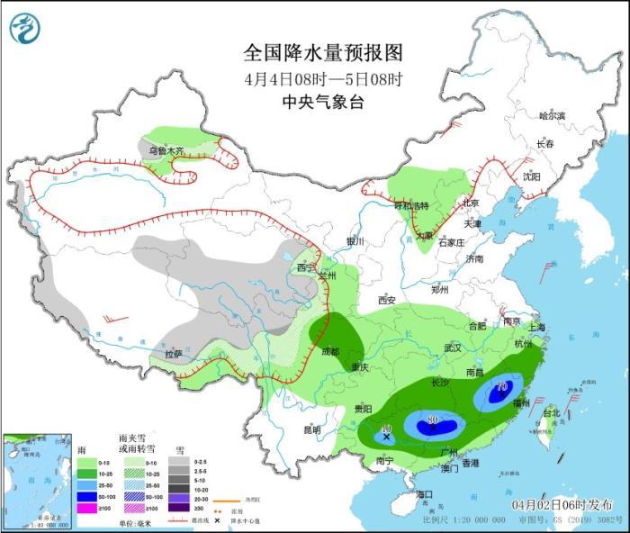 4月4日08時至5日08時,新疆沿天山地區(qū)、西藏南部和東部、青海中南部、甘肅河西、川西高原北部等地部分地區(qū)有小到中雪或雨夾雪。四川盆地大部、重慶西南部、貴州東南部、江南中南部、華南中北部等地部分地區(qū)有中到大雨,其中,福建西北部、廣西東北部、廣東西北部等地部分地區(qū)有暴雨(50~80毫米)。內(nèi)蒙古中部、遼寧北部、西藏南部等地部分地區(qū)有4~5級風(fēng)。