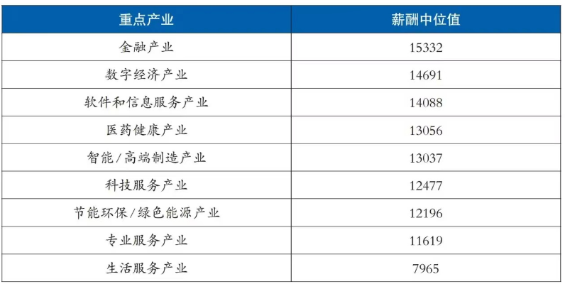 2024年第一季度,重點(diǎn)產(chǎn)業(yè)中金融、數(shù)字經(jīng)濟(jì)、軟件和信息服務(wù)業(yè)薪酬中位值位居前三,分別為 15332 元、14691 元、14088 元,生活服務(wù)產(chǎn)業(yè)薪酬中位值為7965元,漲幅較為突出。