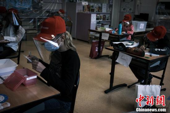 當(dāng)?shù)貢r(shí)間5月12日,法國(guó)中部圣埃蒂安附近的拉格蘭德克羅伊市,當(dāng)?shù)匦W(xué)生戴著統(tǒng)一發(fā)放的面罩上課。據(jù)報(bào)道,當(dāng)?shù)貢r(shí)間5月11日,法國(guó)開始逐步“解封”,結(jié)束已經(jīng)持續(xù)55天的全國(guó)“封城”狀態(tài)。