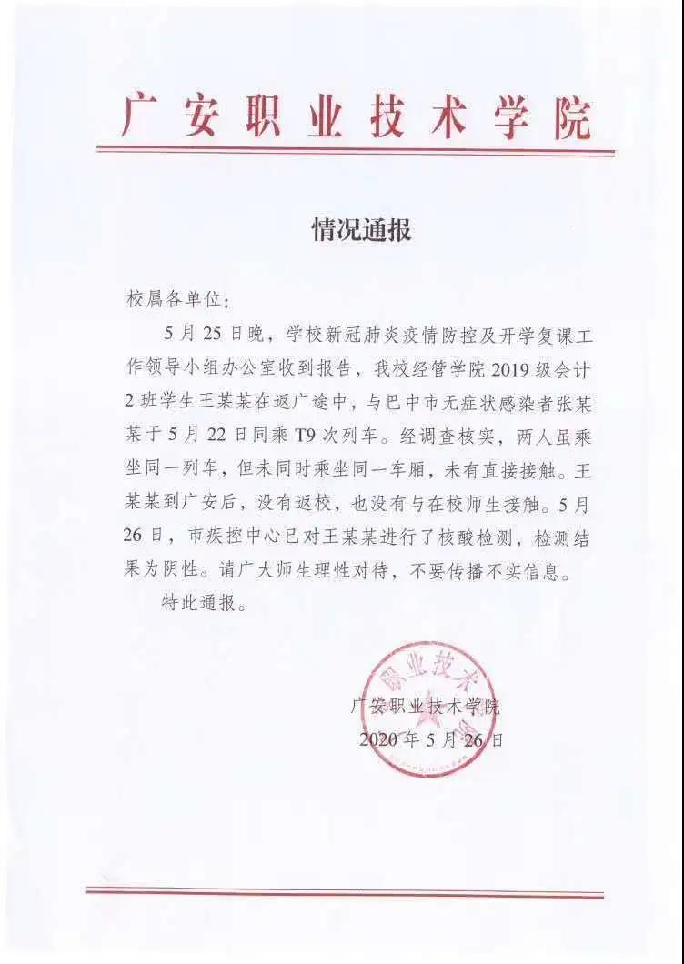 公告稱, 5月25日晚,廣安職業(yè)技術(shù)學(xué)院新冠肺炎疫情防控及開(kāi)學(xué)復(fù)課工作領(lǐng)導(dǎo)小組辦公室收到報(bào)告,該校經(jīng)管學(xué)院2019級(jí)會(huì)計(jì)2班學(xué)生王某某在返廣(安)途中,與巴中市無(wú)癥狀感染者張某某于5月22日同乘T9次列車。經(jīng)調(diào)查核實(shí),兩人雖乘坐同一列車,但未同時(shí)乘坐同一車廂,未有直接接觸。王某某到廣安后,沒(méi)有返校,也沒(méi)有與在校師生接觸。5月26日,廣安市疾控中心對(duì)王某某進(jìn)行核酸檢測(cè),檢測(cè)結(jié)果為陰性。