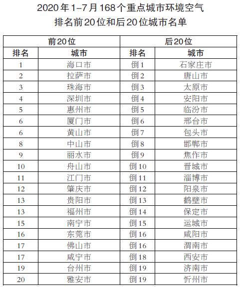 7月,168個(gè)重點(diǎn)城市中唐山、石家莊和太原市等城市空氣質(zhì)量相對較差;珠海、海口和中山市等城市空氣質(zhì)量相對較好。