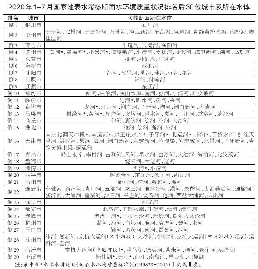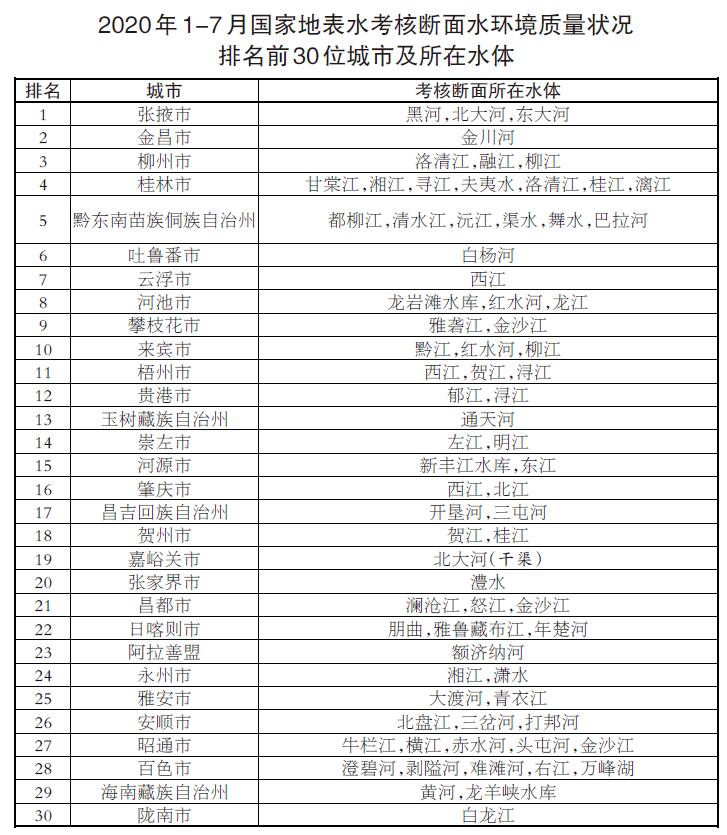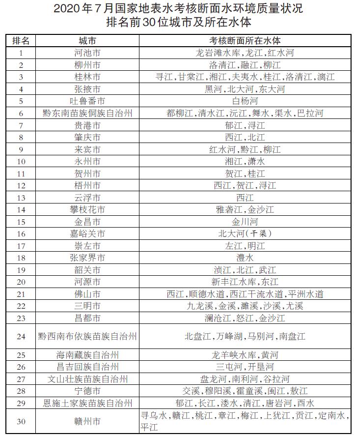參加排名的全國地級及以上城市,覆蓋2050個(gè)國控?cái)嗝妫ㄆ渲?940個(gè)為國家地表水考核斷面,110個(gè)為入??刂茢嗝妫?。7月,全國地級及以上城市中,河池、柳州、桂林等30個(gè)城市國家地表水考核斷面水環(huán)境質(zhì)量相對較好,滄州、鹽城、連云港等30個(gè)城市國家地表水考核斷面水環(huán)境質(zhì)量相對較差;1-7月,全國地級及以上城市中,張掖、金昌、柳州等30個(gè)城市國家地表水考核斷面水環(huán)境質(zhì)量相對較好,銅川、滄州、邢臺等30個(gè)城市國家地表水考核斷面水環(huán)境質(zhì)量相對較差。