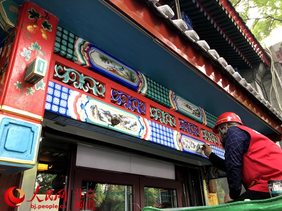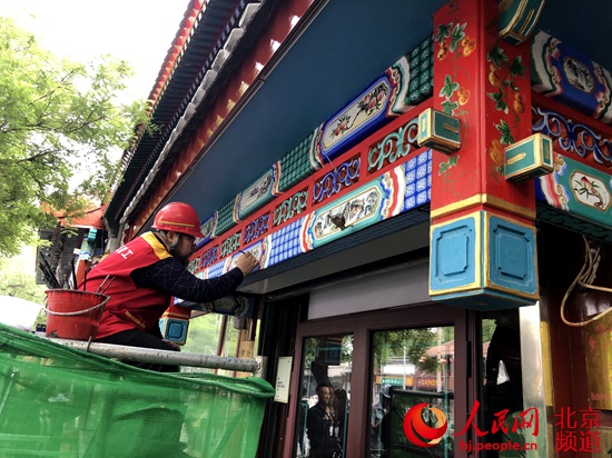 人民網(wǎng)北京5月14日電(池夢蕊)初夏時節(jié),北京南池子大街、北池子大街和東華門大街上綠樹成蔭。建設(shè)者們在街道兩側(cè)的小型圍擋內(nèi)忙碌著,對著一處處木門、門頭、外墻、屋檐和門廊彩繪如切如磋、如琢如磨。