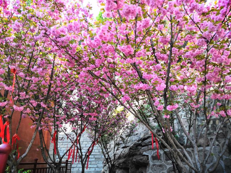 在玄中寺,墻角處十余株櫻花樹滿樹繁花,凋謝的櫻花飄落滿山坡,腳步踏在花片上,形成了一條條用花片鋪成的小道,人們邊走邊觀賞櫻花,也另有一番風景?。▉碓矗航怀强h新聞辦 孫寶忠)