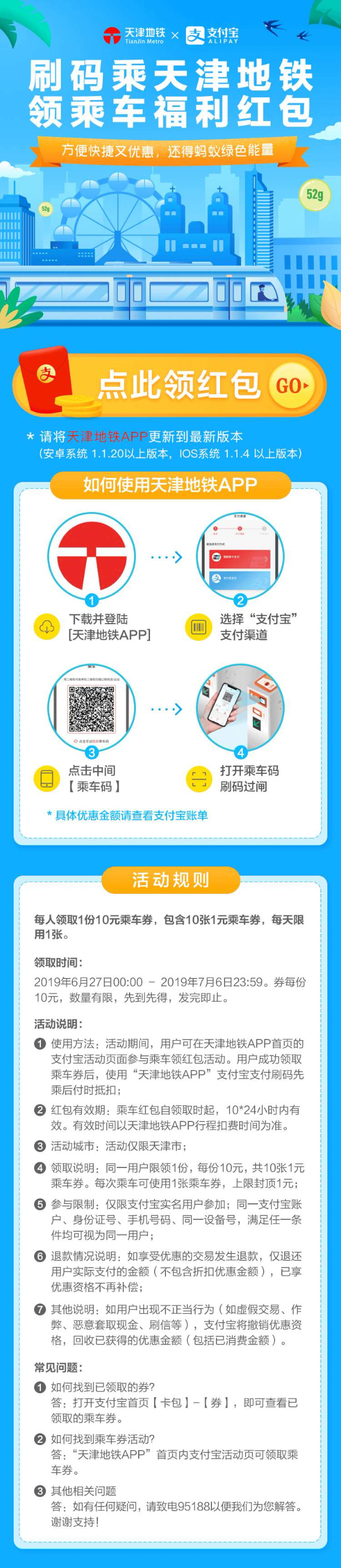 為回饋廣大市民對(duì)天津地鐵的支持,天津軌道交通運(yùn)營(yíng)集團(tuán)有限公司與支付寶(中國(guó))網(wǎng)絡(luò)技術(shù)有限公司聯(lián)合開展出行優(yōu)惠活動(dòng),自2019年6月27日至2019年7月6日期間,乘客可在天津地鐵APP或支付寶APP領(lǐng)取支付寶紅包。