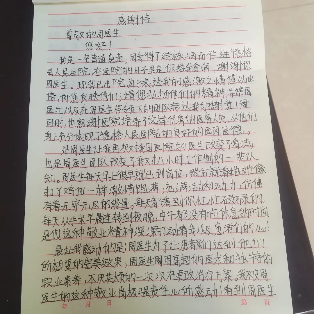 7月1日,一名在德格縣人民醫(yī)院就診的結核患者向成都市公共衛(wèi)生臨床醫(yī)療中心援藏醫(yī)師周瑜送來了一封感謝信,在信中,患者對周瑜醫(yī)生及其團隊在住院期間給予她的積極診治和熱情關懷表示感謝,并對科室團隊的診療技術和治療的預后效果都作出了非常高的評價。