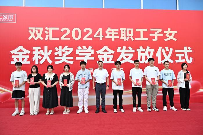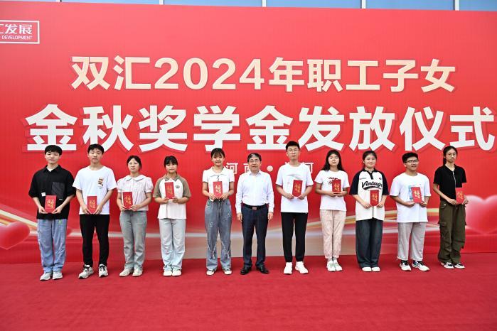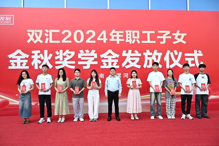 活動現(xiàn)場,雙匯發(fā)展總裁馬相杰,黨委書記、工會主席杜俊甫,副總裁周霄為學(xué)生代表發(fā)放獎學(xué)金并合影留念。其他職工子女現(xiàn)場領(lǐng)取獎學(xué)金。