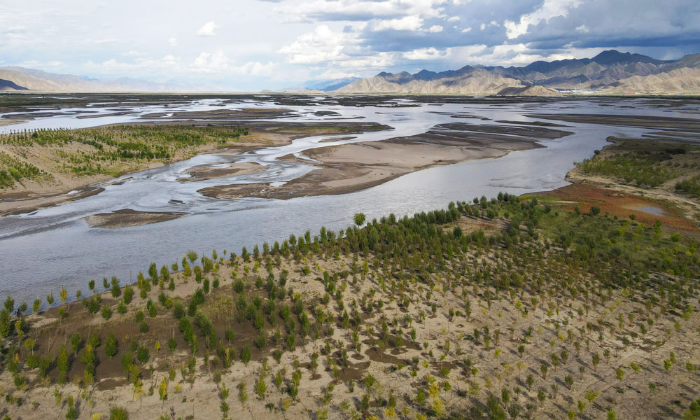雅魯藏布江沿線日喀則市境內(nèi)河岸兩旁綠意盎然(2020年9月4日攝,無人機照片)。 新華社發(fā)(索朗羅布 攝)