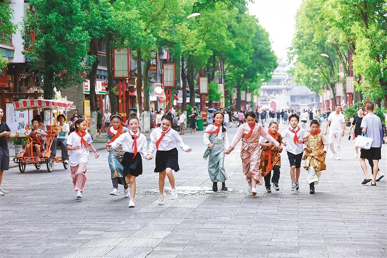 圖為藏渝兩地學生手牽手奔跑在山城街頭。 通訊員 擁金卓嘎 攝