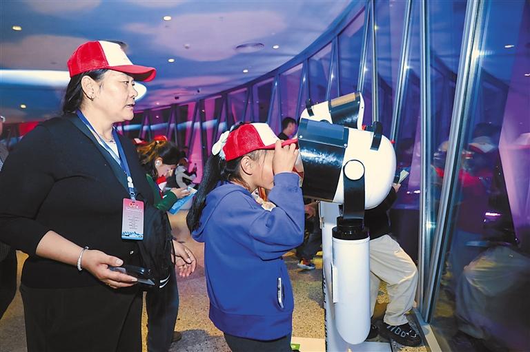 圖為參加冬令營研學交流活動的波密少先隊員在廣州塔用共享望遠鏡眺望廣州城市夜景。記者 謝筱純 攝