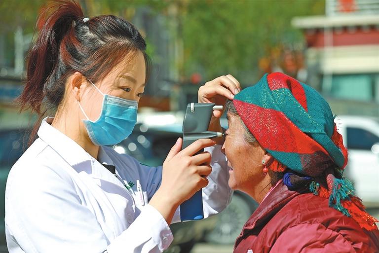 援藏工作隊“雪域光明行”活動中,黑龍江援藏醫(yī)生為群眾檢查眼睛。