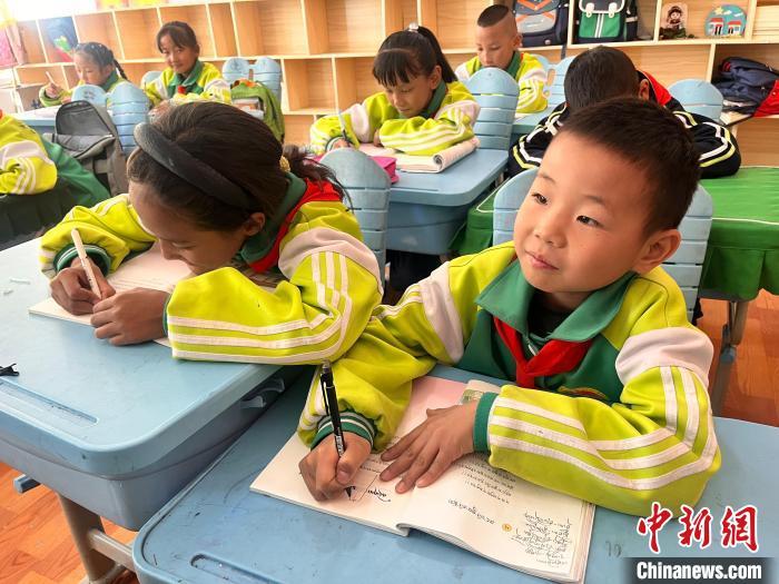 與此同時,四年級2班的漢族學(xué)生劉念恩正在上藏語文課,他抄寫有些慢,同桌的女生立刻用筆幫他找到對照位置?!拔覀儼嘀挥形乙粋€漢族,我也要上藏語文課,同學(xué)們和我關(guān)系非常好,我們經(jīng)常一起踢足球?!眲⒛疃髡f。