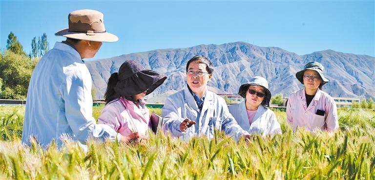 8月16日,山東援藏農(nóng)業(yè)專家、日喀則市農(nóng)牧業(yè)科學(xué)研究推廣中心副主任張斌(中)在青稞試驗(yàn)田里指導(dǎo)種植。經(jīng)濟(jì)日?qǐng)?bào)記者 袁勇 攝