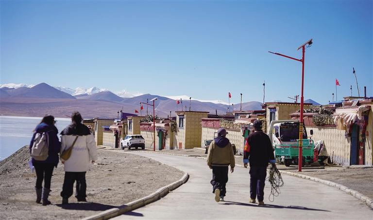 浪卡子縣打隆鎮(zhèn)推瓦村,南部與不丹接壤,邊界線長(zhǎng)達(dá)25公里,是世界上海拔最高的純牧業(yè)行政村之一。全村共有40戶人家,153位村民在此生活。2月6日,記者踏入推瓦村,首先映入眼簾的是遠(yuǎn)處的普姆擁措湖,湖面在陽光的照耀下波光粼粼,與錯(cuò)落有致的雪山相互映襯,構(gòu)成一幅絕美的畫面。沿著平坦的柏油馬路前行,道路兩旁整齊排列的路燈和一排排以溫馨黃色為主色調(diào)的邊境小康房格外引人注目。漫步在臨近冰湖的村路上,悠然愜意之感油然而生,雪山、湖泊、村落與村民們和諧相融,共同繪就了一幅寧靜祥和的鄉(xiāng)村畫卷。