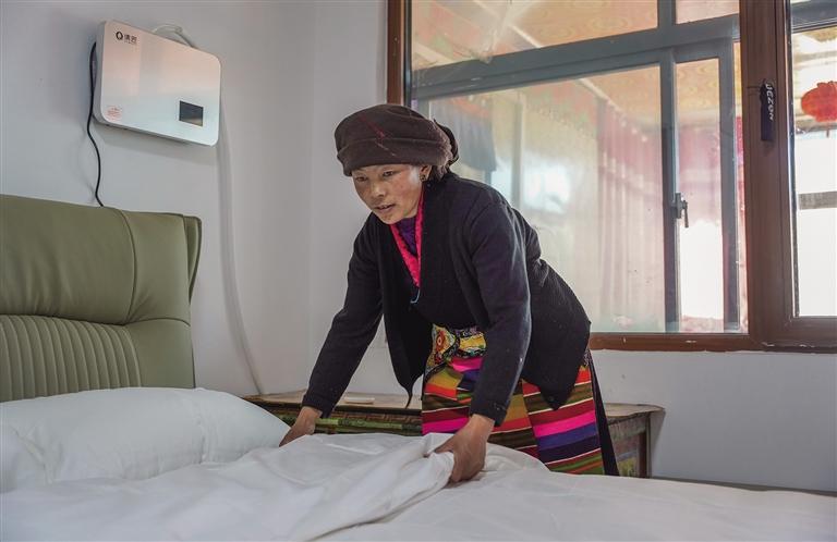 倫珠曲珍今年40歲,是這家的二女兒,15年前嫁到外村,每年都會(huì)回來看望父母。由于同行的人員出現(xiàn)高反癥狀,倫珠曲珍便主動(dòng)邀請(qǐng)記者到他們家的“高原暖心房”里休息調(diào)整。“高原暖心房”設(shè)置在她家客廳的里側(cè),屋內(nèi)寬敞明亮、干凈整潔。墻壁上的恒溫裝置讓屋子始終保持在宜人的20攝氏度左右?!拔覀兇蛟斓摹咴姆俊銣匦Ч貏e好,最高溫度能達(dá)到30多攝氏度。而且因?yàn)槭褂玫牟馁|(zhì)特殊,就算不開恒溫裝置,幾個(gè)人待在屋里也不會(huì)覺得冷??纯催@些家具,都是村里愛心小屋提供的?!绷涡駯|介紹道。