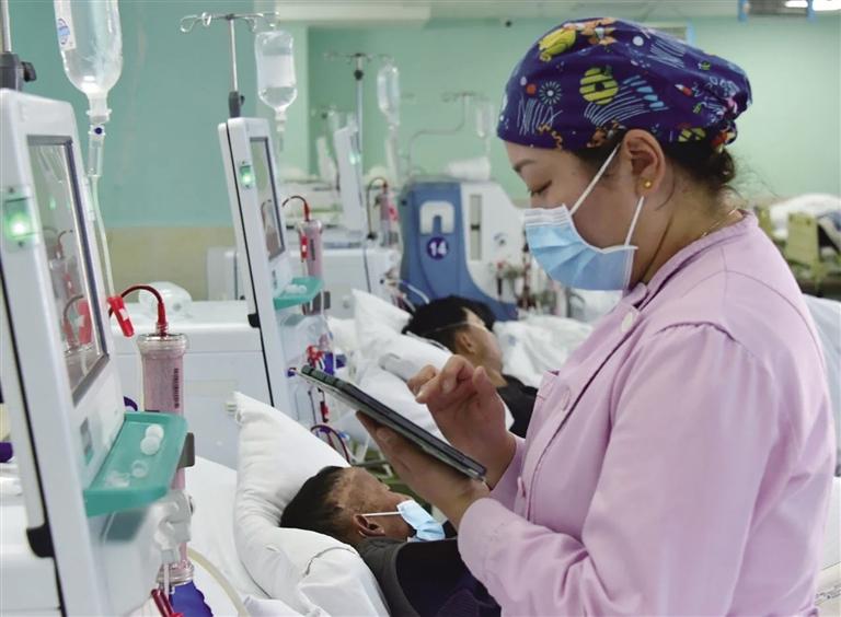 護士在調(diào)整透析參數(shù)。圖由自治區(qū)人民醫(yī)院提供