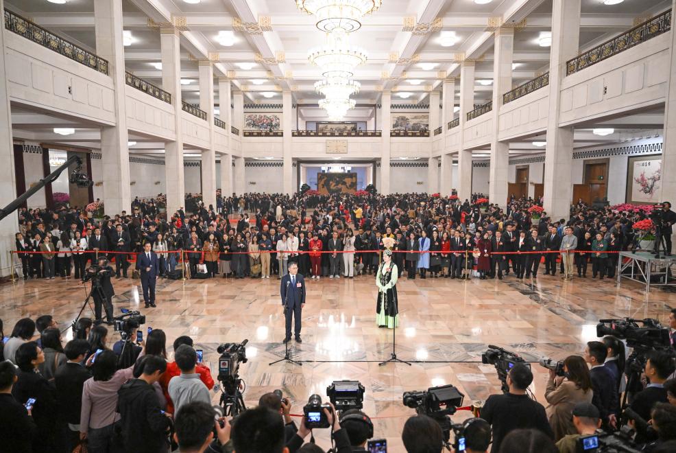 閉幕會(huì)前,人民大會(huì)堂中央大廳北側(cè),第三場(chǎng)“代表通道”集體采訪活動(dòng)正在進(jìn)行。