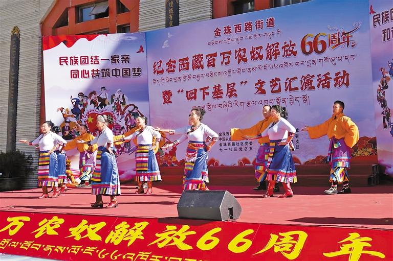 圖為拉薩市城關(guān)區(qū)金珠西路街道舉辦紀念西藏百萬農(nóng)奴解放66周年暨“四下基層”文藝匯演活動現(xiàn)場。通訊員 扈顯嶺 攝