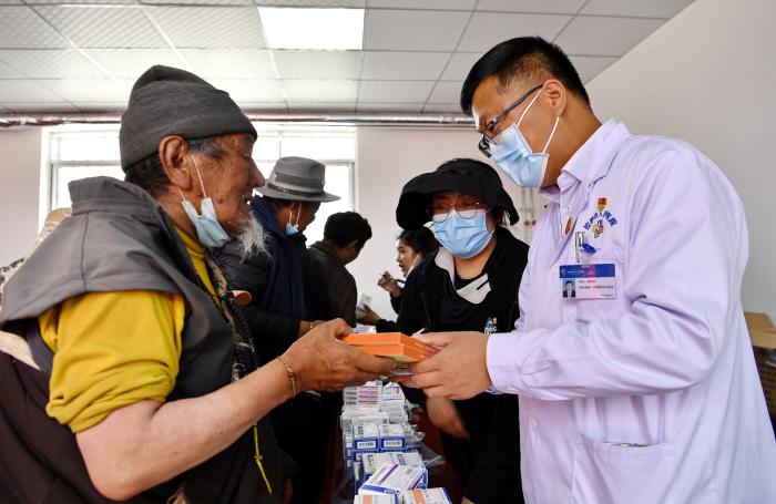 圖為2022年6月9日,時任拉薩市人民醫(yī)院院長、北京市第七批醫(yī)療人才“組團式”援藏醫(yī)療隊隊長孫樹學(xué)(前排右)在拉薩市當(dāng)雄縣格達鄉(xiāng)為群眾義診發(fā)藥 受訪者供圖