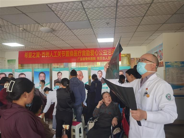 廣東援藏醫(yī)生在百例人工關(guān)節(jié)置換醫(yī)療救助愛心公益活動中查看片子。