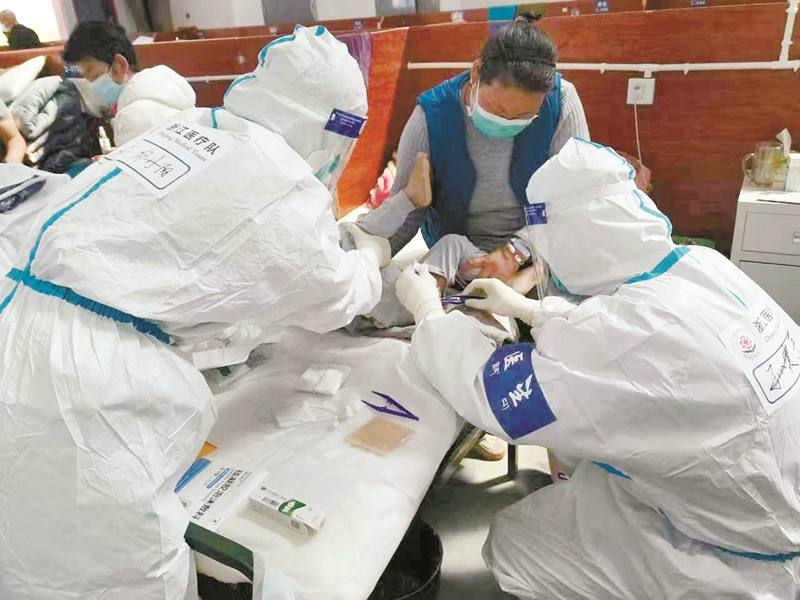 圖為浙江援藏醫(yī)療隊醫(yī)護(hù)人員在方艙內(nèi)對患者進(jìn)行救治。 (浙江援藏醫(yī)療隊供圖)