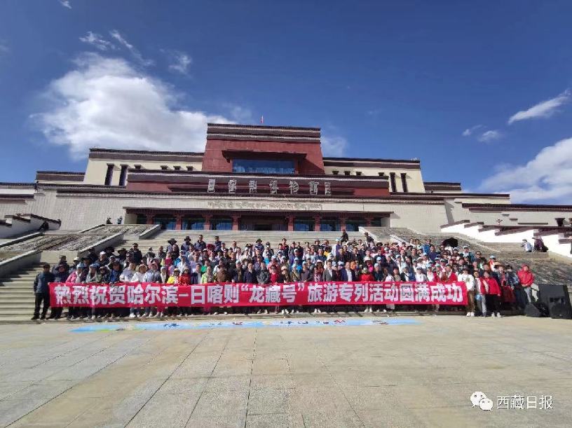 歡迎儀式上,日喀則市領(lǐng)導(dǎo)、市直相關(guān)單位負(fù)責(zé)人,黑龍江省第八批援藏工作隊(duì)員與游客們?cè)谌湛t博物館前合影留念,熱烈祝賀哈爾濱-日喀則“龍藏號(hào)”旅游專列活動(dòng)圓滿成功。