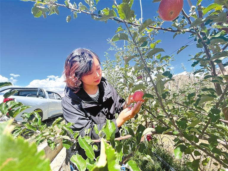 圖為毛莎莎在扎囊縣朗賽嶺矮化蘋果種植基地里查看蘋果長勢(shì)。 見習(xí)記者 武沛濤 攝