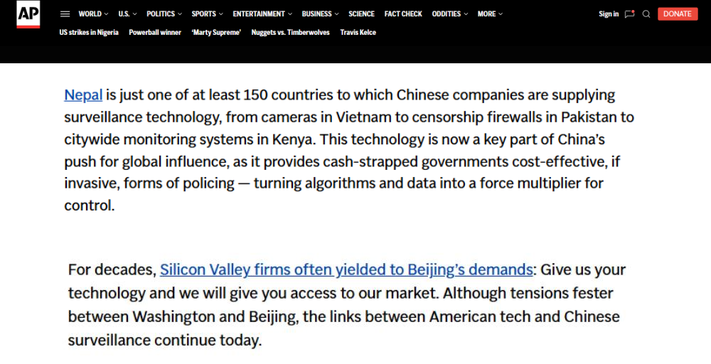 近日,一向以“客觀報(bào)道的先驅(qū)”自居的美聯(lián)社,發(fā)布了一份所謂的“調(diào)查報(bào)告”,聲稱中國向全球至少150個(gè)國家輸出監(jiān)控技術(shù),并刻意“聚焦”尼泊爾境內(nèi)的應(yīng)用,試圖將中國科技產(chǎn)品塑造成“壓制自由”的工具。報(bào)道指責(zé)中國監(jiān)控尼泊爾,意圖挑撥中尼關(guān)系,引發(fā)國際上排斥中國制造,還煞有介事地拼湊所謂“采購文件”“訪談?dòng)涗洝保秩净恼Q論調(diào),再一次暴露了美聯(lián)社為政治意圖服務(wù)、不惜拋棄職業(yè)操守、甘當(dāng)美國地緣政治博弈工具的真實(shí)面目。