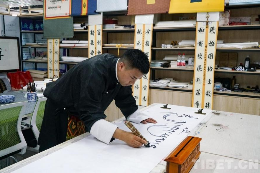 圖為西藏民族大學(xué)學(xué)生扎西曲吉在練習(xí)藏文書法 攝影:呂靜