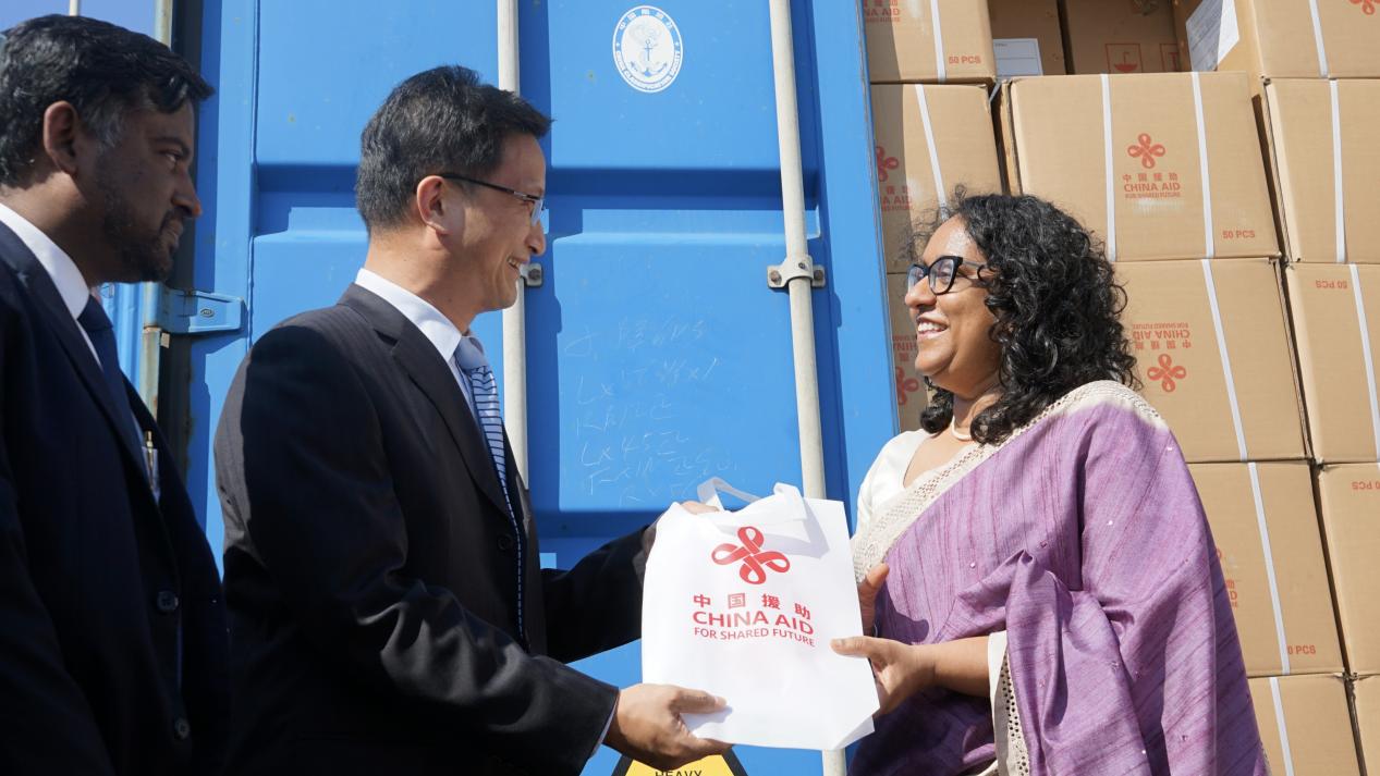 圖為2026年1月13日,中國駐斯大使戚振宏與斯總理阿馬拉蘇里亞前往科倫坡國際集裝箱碼頭迎接中國援斯2026年校服布料。來源:中華人民共和國商務部網(wǎng)站