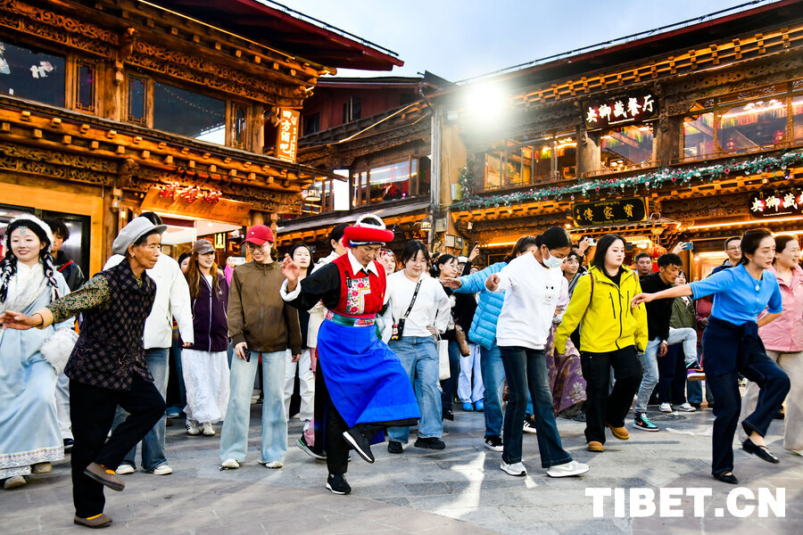 2025年8月16日,在云南省迪慶藏族自治州香格里拉市建塘鎮(zhèn)獨(dú)克宗古城龜山公園腳下古城內(nèi),各民族同胞一起跳起鍋莊舞。攝影:趙振宇
