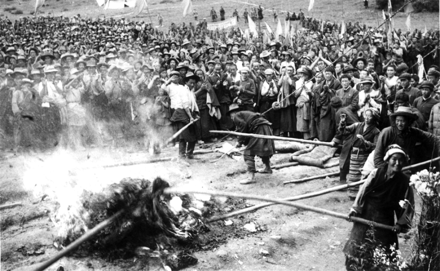 1959年3月,西藏百萬農(nóng)奴翻身獲得解放。這是1959年夏,拉薩達孜縣塔杰鄉(xiāng)、章多鄉(xiāng)翻身農(nóng)奴焚燒地契、文契和債約。 來源:西藏文化博物館
