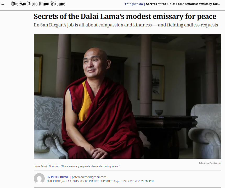 2015年丹增東登接受美國《圣地亞哥聯(lián)合論壇報》采訪。該媒體當時稱其為“達賴喇嘛謙遜的和平使者”,現(xiàn)在讀來頗感諷刺。