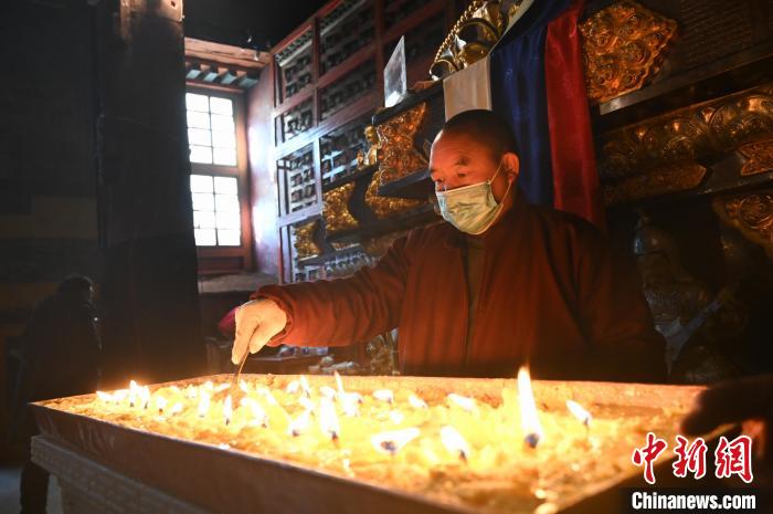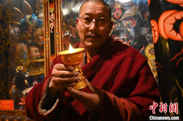 圖為洛卓土美巡查佛殿。趙朗 攝