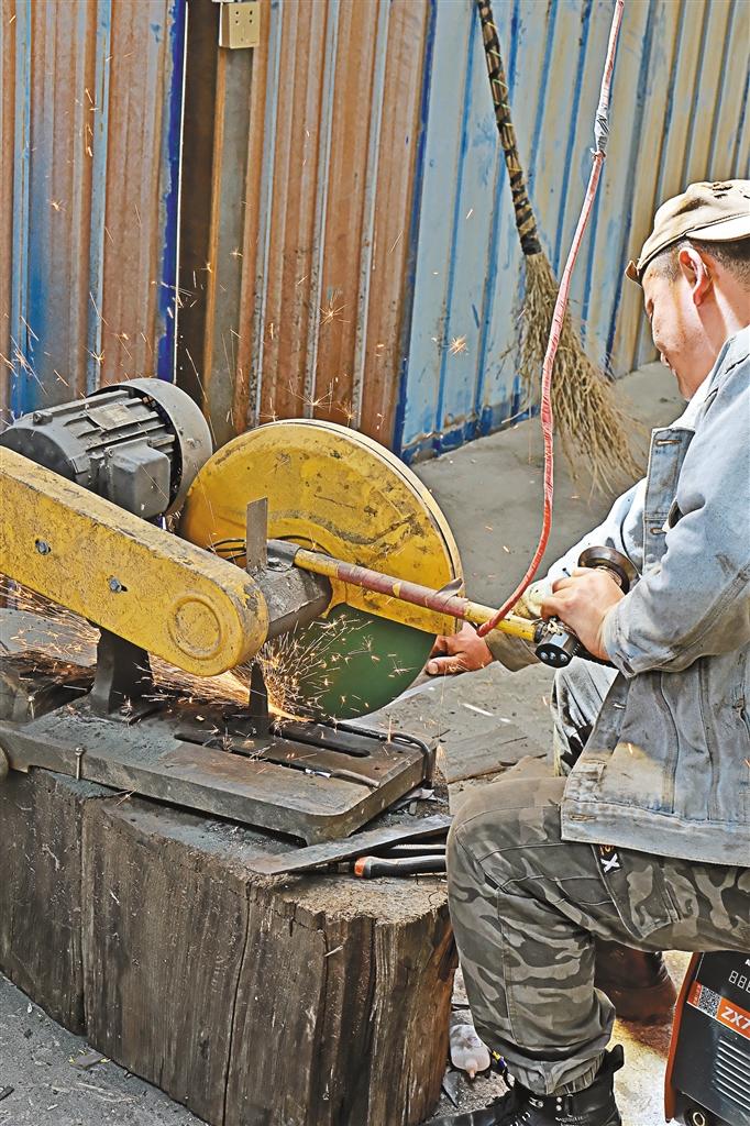 沿著民居錯(cuò)落的小路攀爬而上,來(lái)到江拉村易貢藏刀打制農(nóng)牧民合作社,傳承人西洛正在和線(xiàn)上購(gòu)買(mǎi)者交流。寬敞的院壩和簡(jiǎn)易工作間里,木屑紛飛、火花四濺、錚錚有聲,幾十個(gè)村民正在藏刀制作“流水線(xiàn)”上忙碌,一路采訪(fǎng)下來(lái),我們也大致明白了易貢藏刀的制作流程: